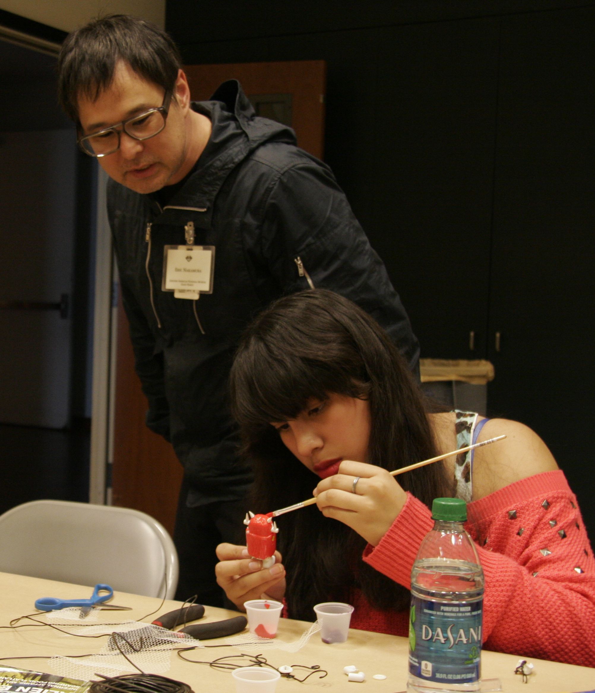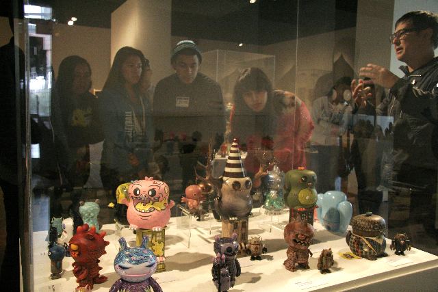 Eric Nakamura and students viewing the custom figures in the Project Remix show