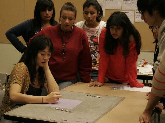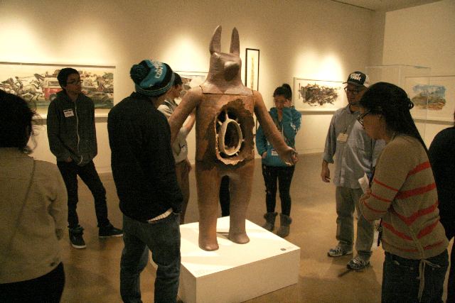 Students in the galleries discuss Ako Castuera's work.