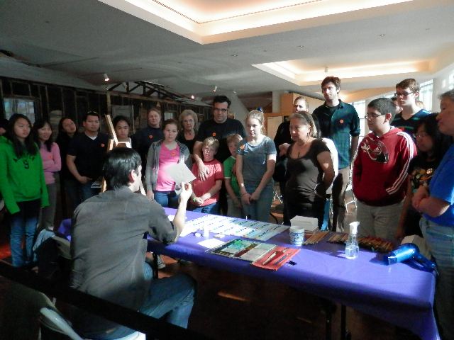 A popular activity of the evening was custom finishing a button using designs started by GRB4 artists. Photo by Ben Furuta.