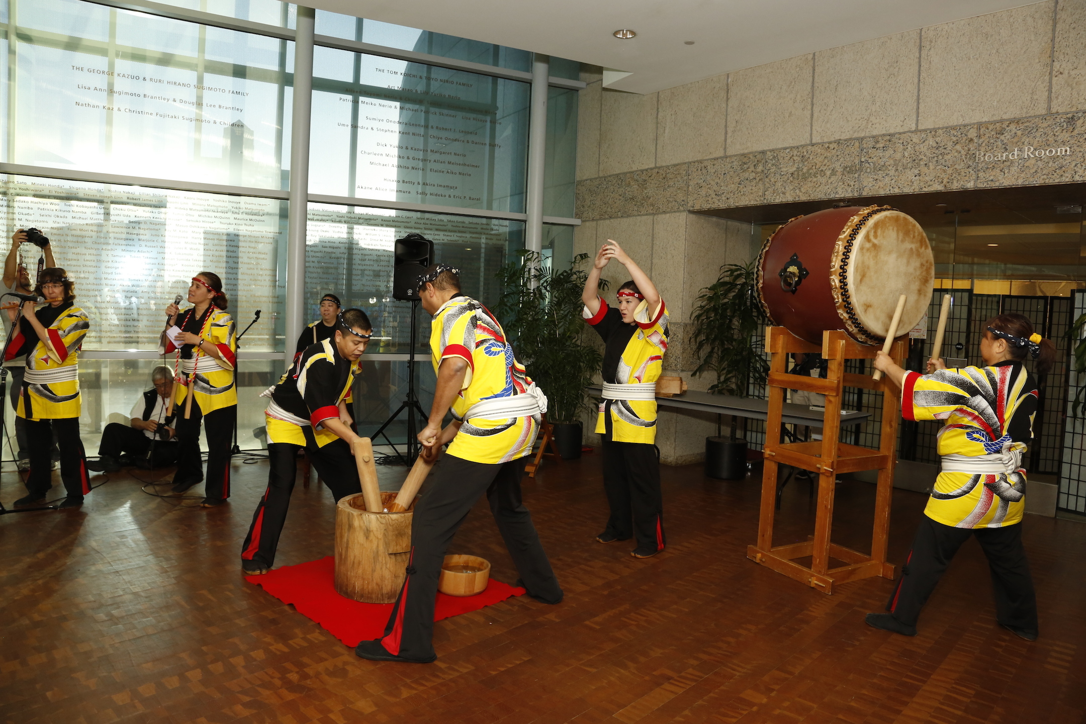 Kodama Taiko performs a demonstration of mochitsuki, a traditional rice cake pounding ceremony.